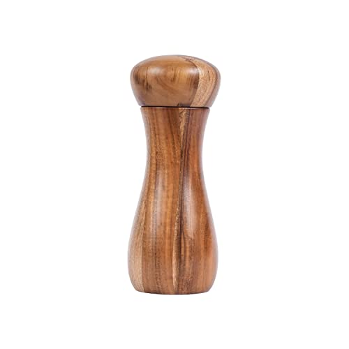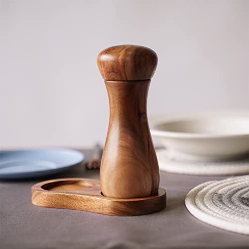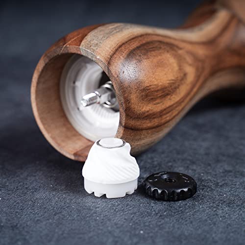 DeroTeno Macinapepe, Macinino per il pepe, Macinapepe in Ceramica Regolabile sia per Pepe che per Sale, Legno di Acacia, Altezza 15,5 cm, Diametro 6 cm (Vassoio NON Incluso)