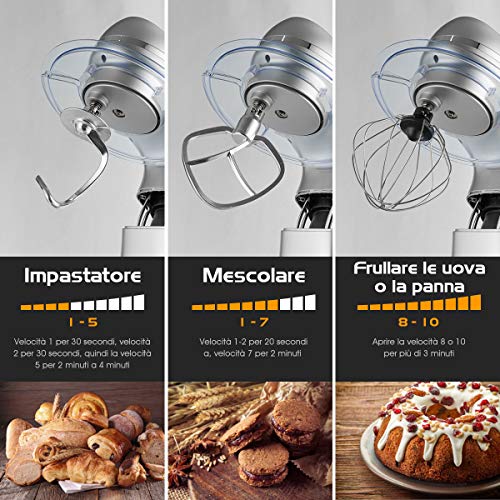 Potente Motore e 10 Velocità Variabili: Con il motore in rame puro, questa impastatrice ha una grande potenza di 1300 W. Le 10 velocità si possono selezionare in base agli ingredienti e alla ricetta da preparare.