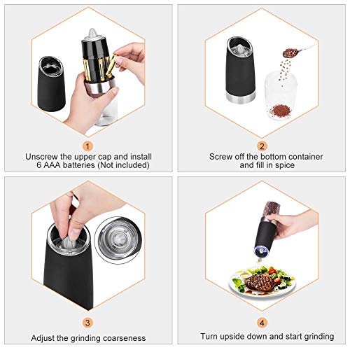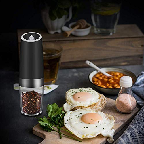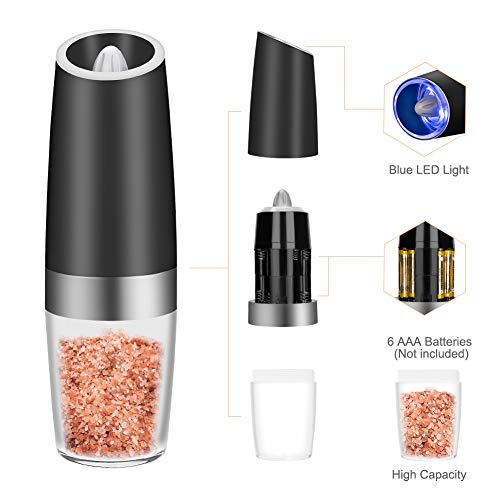 【INTERRUTTORE A GRAVITÀ】 Semplicemente inclinare il pepe macinato sale, il LED blu si accenderà automaticamente, attivare la macina spezie per lavorare. Ritorna in verticale per fermare il sale e il pepe. Comodo e facile da usare con una sola mano.